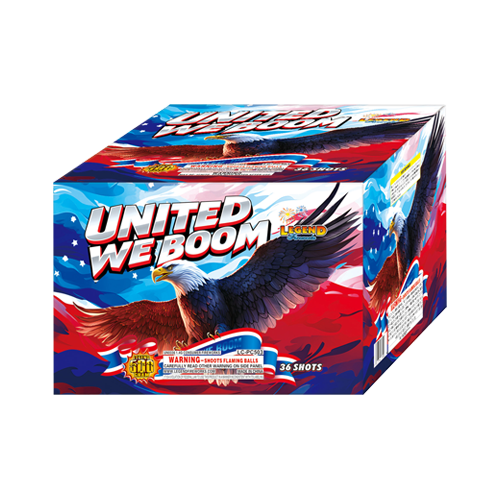 When we ignite UNITED WE BOOM, the celebration unites us all! Red tail to red lace and crackles, blue tail to red blue dahlia and silver strobe, red tail to chrys rain and red strobe, red tail to red poppy and silver strobe, blue tail to brocade crown and blue plus red strobe, time rain mines to chrys rain, time rain mines to blue and green red falling leaves.